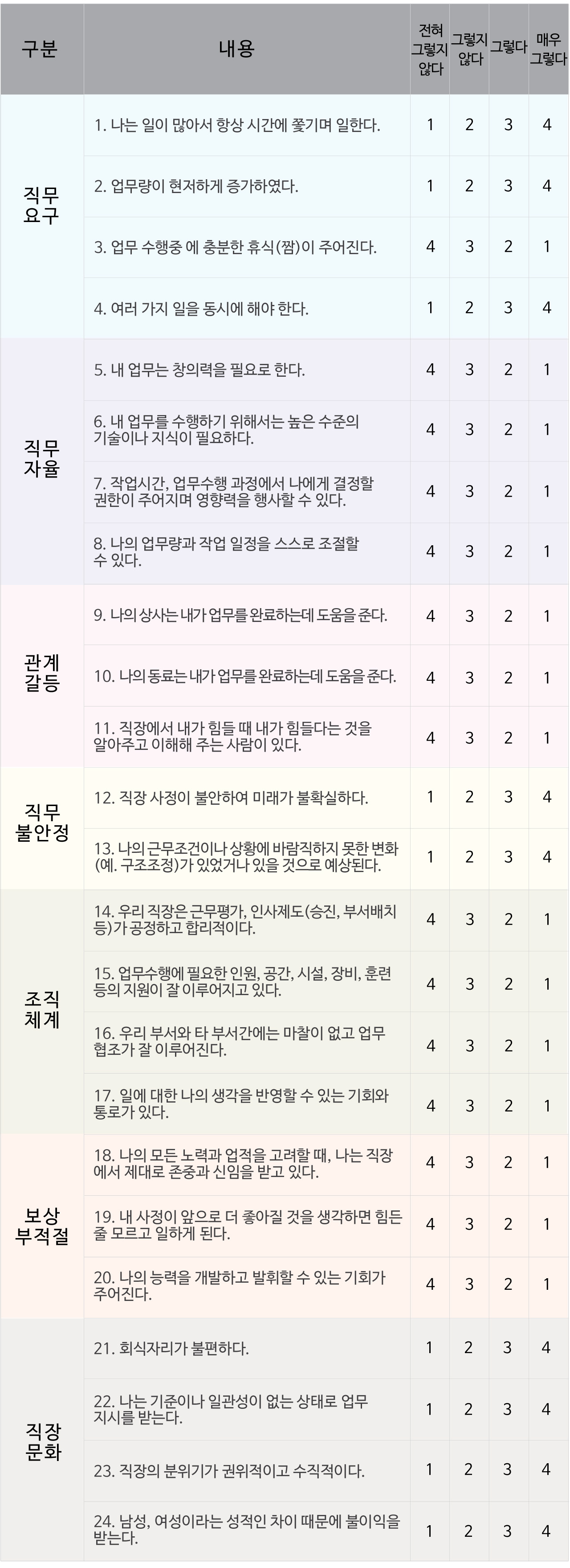 ¡Ø Á÷¹«½ºÆ®·¹½º¿¡ ¿µÇâÀ» ³¢Ä¡´Â ¿ä¼Ò¿¡ ±âÀÎÇÏ¿© ½ºÆ®·¹½º Á¤µµ¸¦ ÃøÁ¤ÇÏ¸ç Æò°¡¸¦ ½Ç½ÃÇÕ´Ï´Ù.
